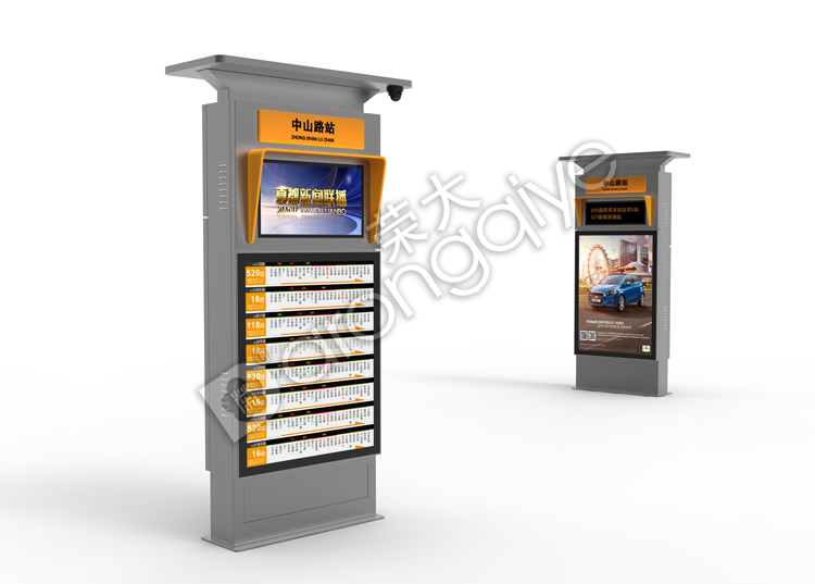 電子公交站牌是較智能的一種現代化設施,多采用全球衛星定位導航技術(GPS)、地理信息系統技術(GIS-T)、智能傳感器、3G視頻技術以及語音通信技術,有機結合的新一代智能電子站牌功能系統。